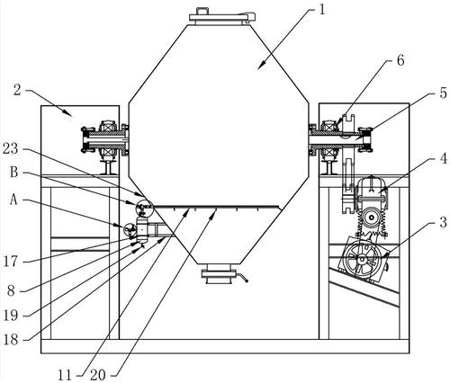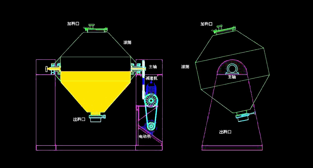 The W-type double cone mixer consists of a double cone cylinder, mechanical seal, frame, reduction drive, mixing blades, etc. The working process of the machine is: several materials to be mixed are vacuum conveyed or manually added into the double cone body, the cylinder cover is closed, the equipment is opened, and the double cone cylinder and stirring blades rotate simultaneously. The rotating double cone cylinder causes the materials inside the cylinder to produce chaotic rolling and mixing, and the high-speed rotating stirring blades break down the agglomerated materials, allowing the materials to mix quickly inside the cylinder. The W-type double cone mixer has no dead corners or sedimentation during the working process, which can quickly achieve uniform and consistent mixing of materials.