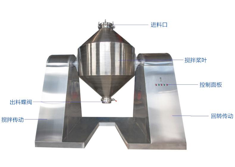 The W-type double cone mixer is a new type of fine container rotary and stirring mixing equipment, used for uniform mixing of various powdered and granular materials, with high mixing degree, and can achieve good mixing degree for ingredients with small addition amount; The machine adopts mechanical sealing, which prevents powder leakage and has a long service life for the bearings; This machine has high mixing efficiency, high working efficiency, low labor intensity, and easy operation. Can be used in industries such as magnetic powder, ceramics, chemical, pharmaceutical, and feed.