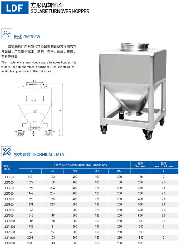 The turnover hopper is refined with high-quality austenitic stainless steel, and all corners of the inner and outer surfaces have rounded transitions without dead corners or residues. The inner surface has been highly polished to achieve a roughness of Ra ≤ 0.2 μ m, while the outer surface has undergone sub gloss treatment to achieve a roughness of Ra ≤ 0.4 μ m. The bucket cover is equipped with a silicone rubber sealing device to ensure the sealing of the turnover hopper; Design a special butterfly valve with anti misoperation device to ensure production safety. Equipped with specially designed wheels, it protects the self leveling floor of the clean area from damage and leaves no traces. Fully comply with GMP requirements for drug production.