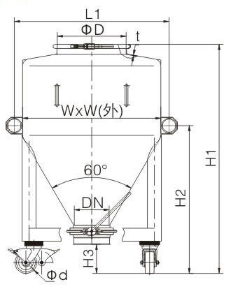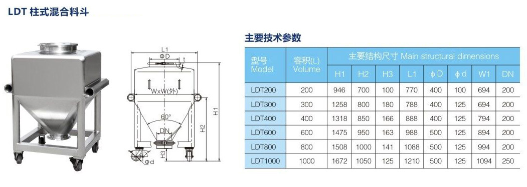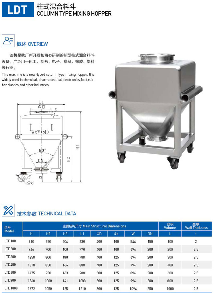 The price of LDT column mixing hopper varies depending on the nature of the customer's material, choosing different materials such as SUS304 or SUS316L. The inner wall of the hopper is polished with a mirror finish (RA ≤ 0.4 μ m), and the outer surface is treated with a matte finish (RA ≤ 0.6 μ m). Smooth without dead corners, easy to clean.